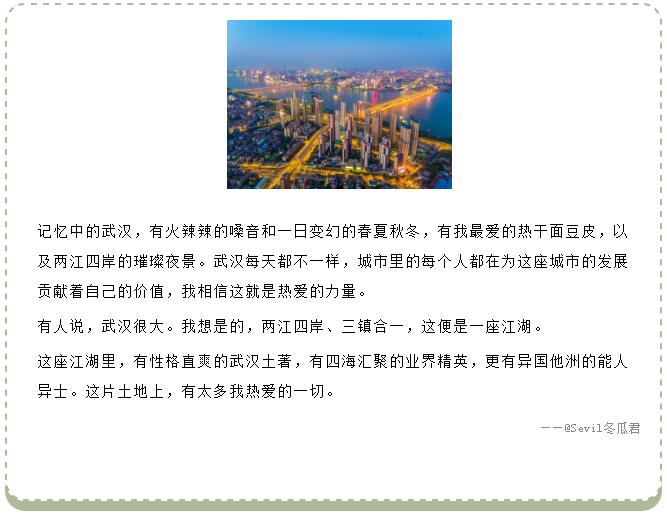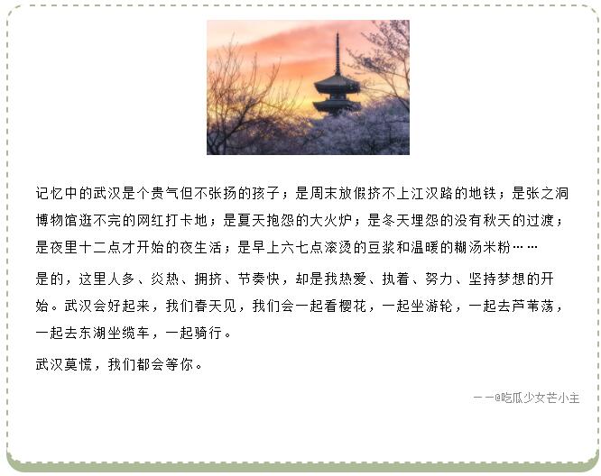 今天是元宵節(jié),一元復(fù)始,大地回春,草木萌發(fā),春山可望。元宵該是熱鬧的,可在疫情籠罩的當(dāng)下,平安健康就是最大的福。靜下心來看看曾經(jīng)的武漢吧,愿重回往日,早日安康。