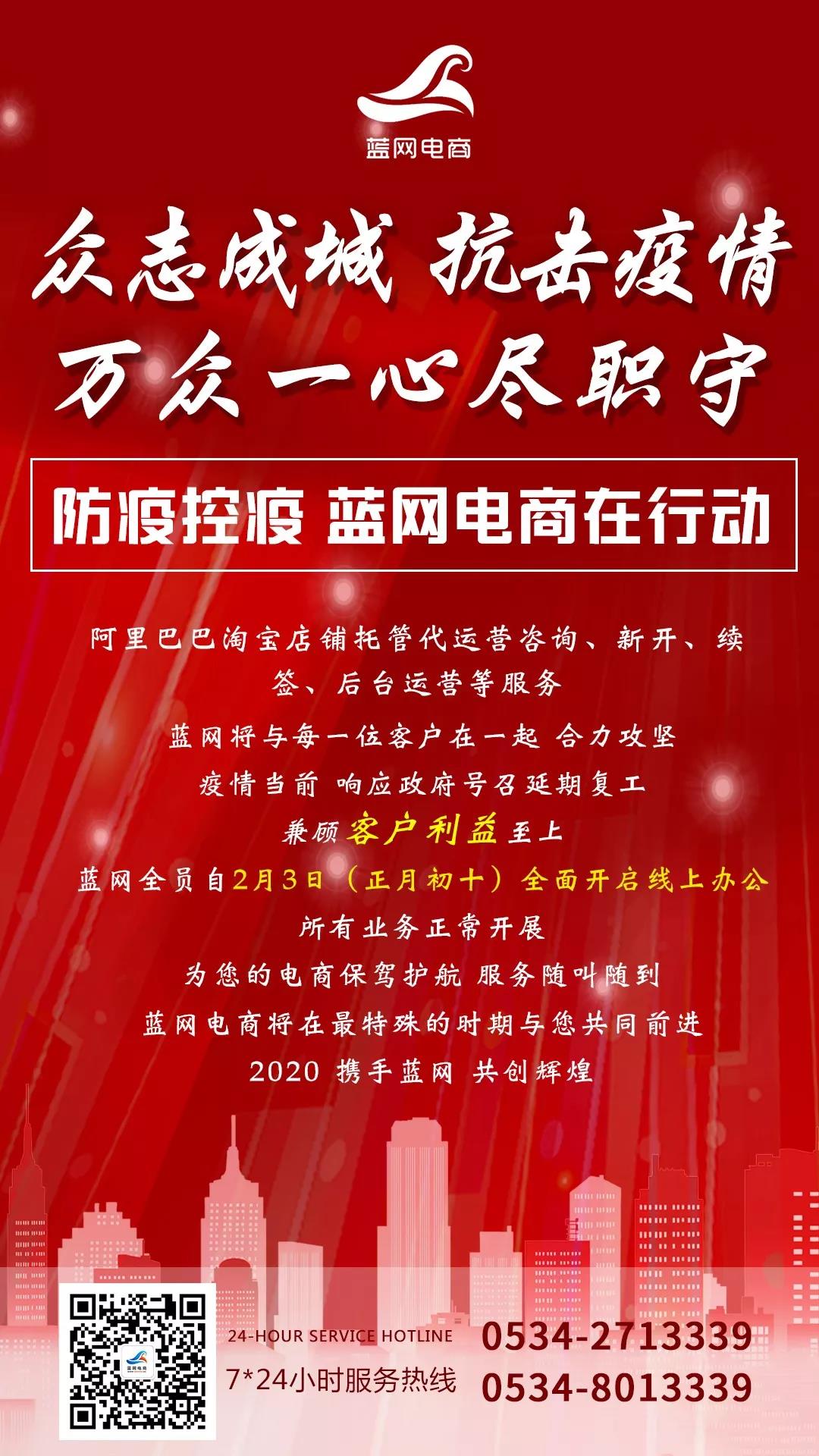 防疫控疫,藍(lán)網(wǎng)電商在行動(dòng) 眾志成城抗疫情 萬(wàn)眾一心盡職守 阿里巴巴淘寶店鋪托管代運(yùn)營(yíng)咨詢(xún)、新開(kāi)、續(xù)簽、后臺(tái)運(yùn)營(yíng)等服務(wù) 藍(lán)網(wǎng)將與每一個(gè)客戶(hù)一起 合力攻堅(jiān) 疫情當(dāng)前 響應(yīng)政府號(hào)召延期復(fù)工 兼顧客戶(hù)利益至上 藍(lán)網(wǎng)電商全員2月3日(正月初十)全面開(kāi)啟線上辦公 所有業(yè)務(wù)正常開(kāi)展 7*24小時(shí)不打烊 為您的電商保駕護(hù)航 服務(wù)隨叫隨到 藍(lán)網(wǎng)電商將在最特殊的時(shí)期與您共同前進(jìn) 電話-微信里我們一樣用心為您服務(wù)! 2020年攜手藍(lán)網(wǎng) 共創(chuàng)輝煌!