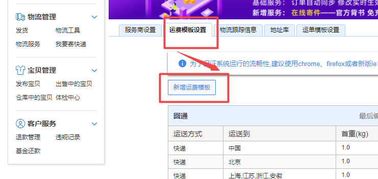 二、選擇好服務商后,就可以進入運費模板設置,選擇新增運費模板