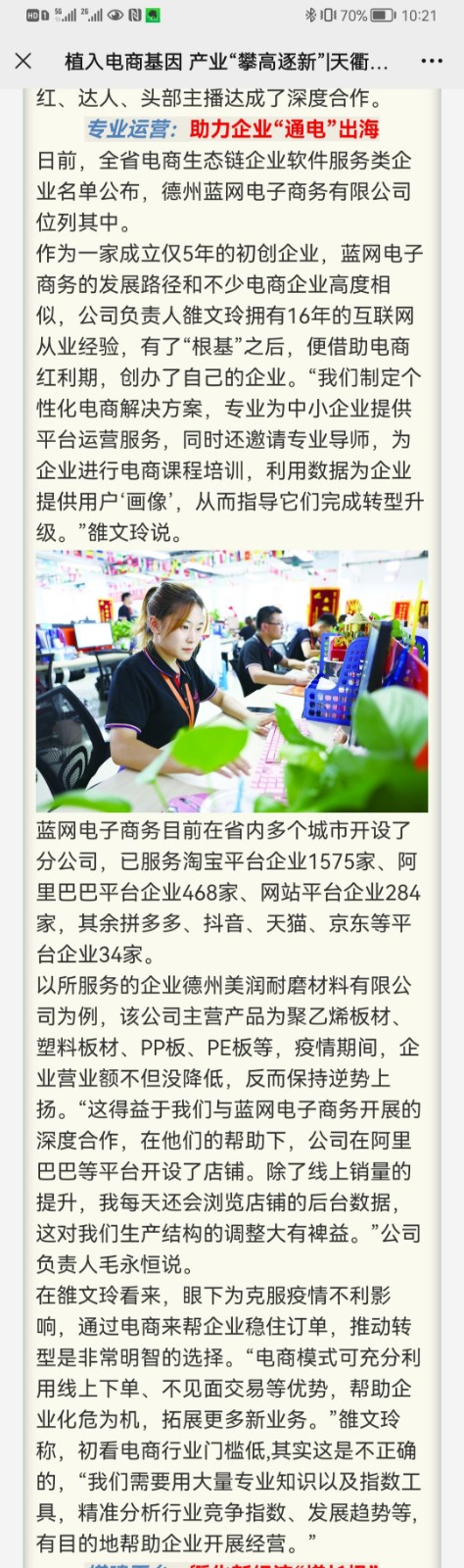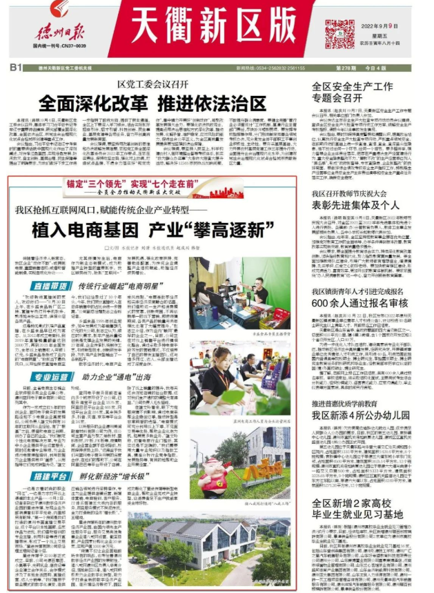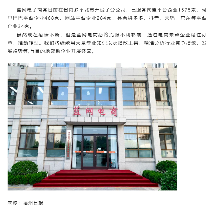 編注:9月9日,《德州日報》對藍(lán)網(wǎng)電商進行報道。文中提及,專業(yè)運營:助力企業(yè)“通電”出海:目前,全省電商生態(tài)鏈企業(yè)軟件服務(wù)類企業(yè)名單公布,德州藍(lán)網(wǎng)電子商務(wù)有限公司位列其中。